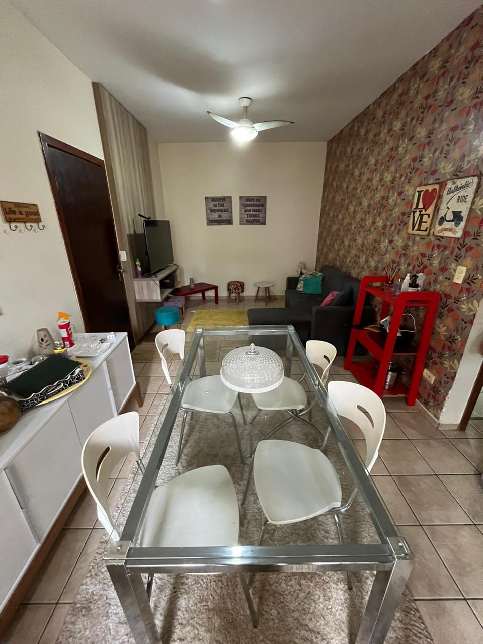 Contém sala dois ambientes( jantar e TV ) uma suíte, dois quartos, banheiro, sacada uma vaga de garagem, uma vaga de garagem para visitante e uma para moto.