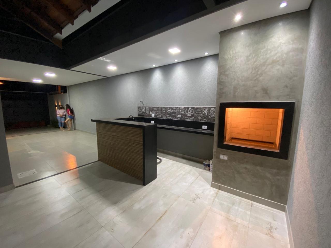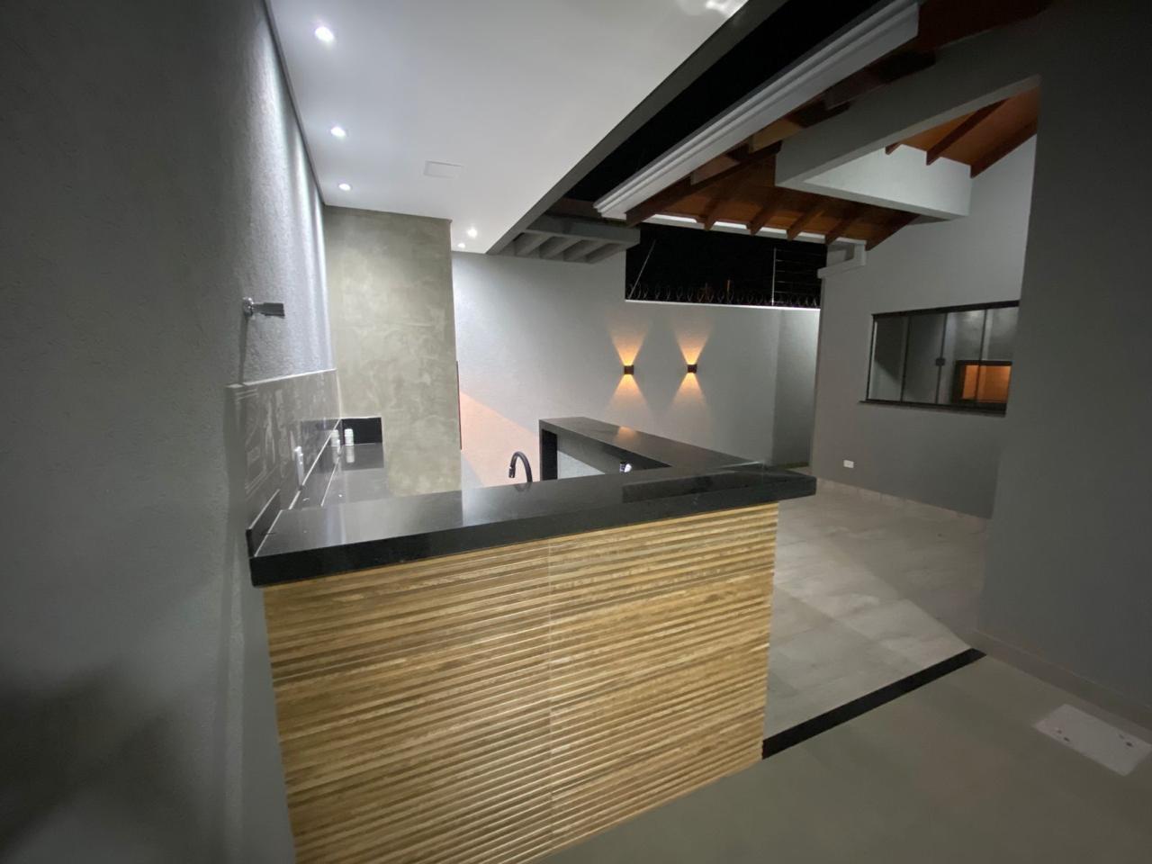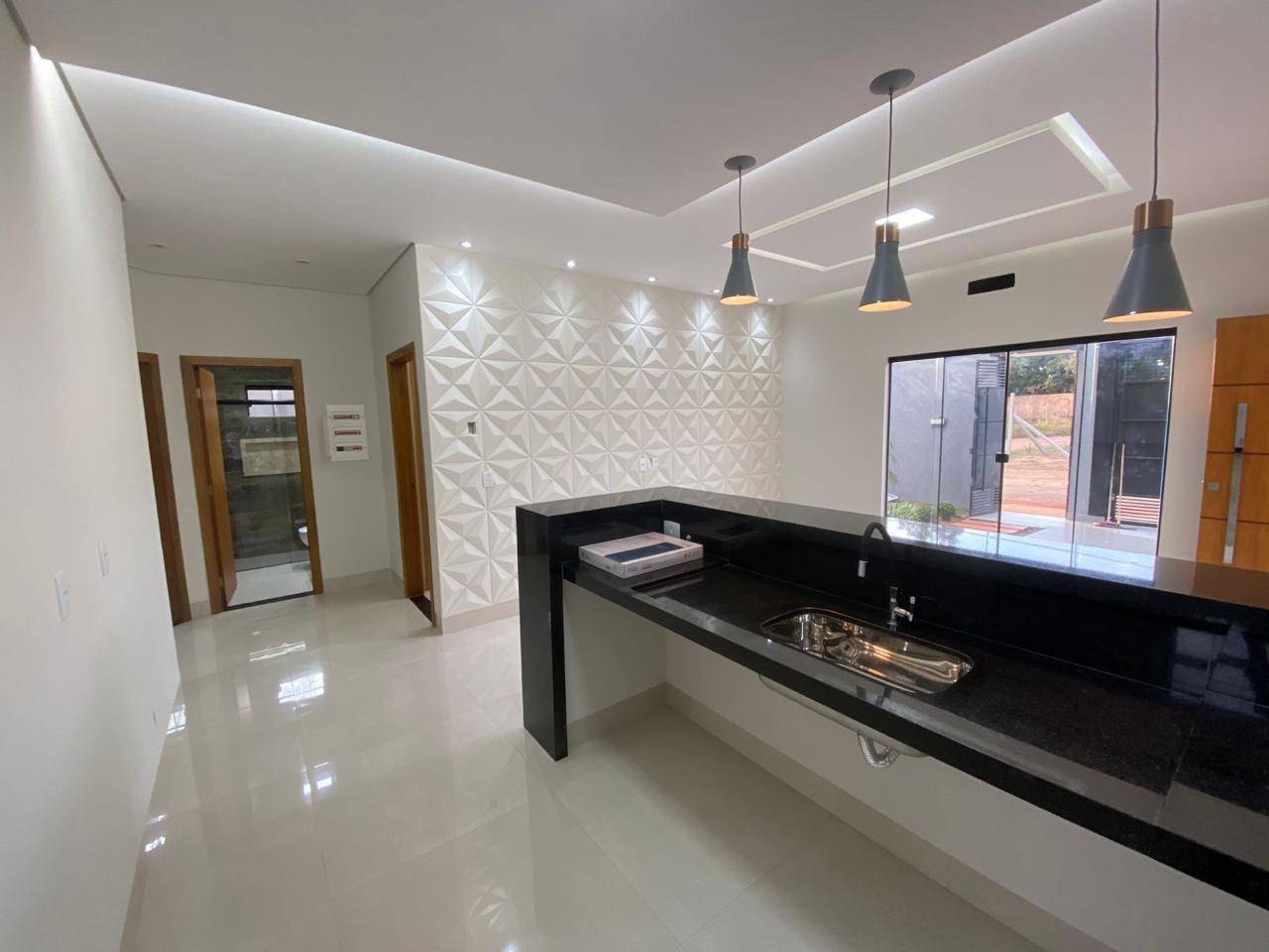 Composta por sala de estar, cozinha americana, 3 quartos sendo 1 suíte, área gourmet com churrasqueira revestida em marmóreo planejadas e bancadas toda em granito preto, Lavanderia coberta, garagem para 3 carros. Pré instalação de ar condicionado em todos os cômodos, Gesso 3D na parede da sala. Laje rebaixo de gesso com LED em todos os cômodos e no Jardim, porcelanato polido interno, porcelanato acetinado externo, pedra granito São Gabriel e travertino, box nos banheiros, blindex com moldura preta moderna. Imóvel com cerca elétrica, concertina e interfone