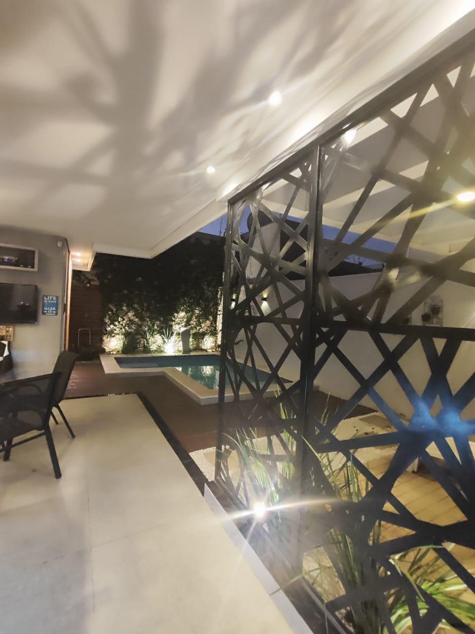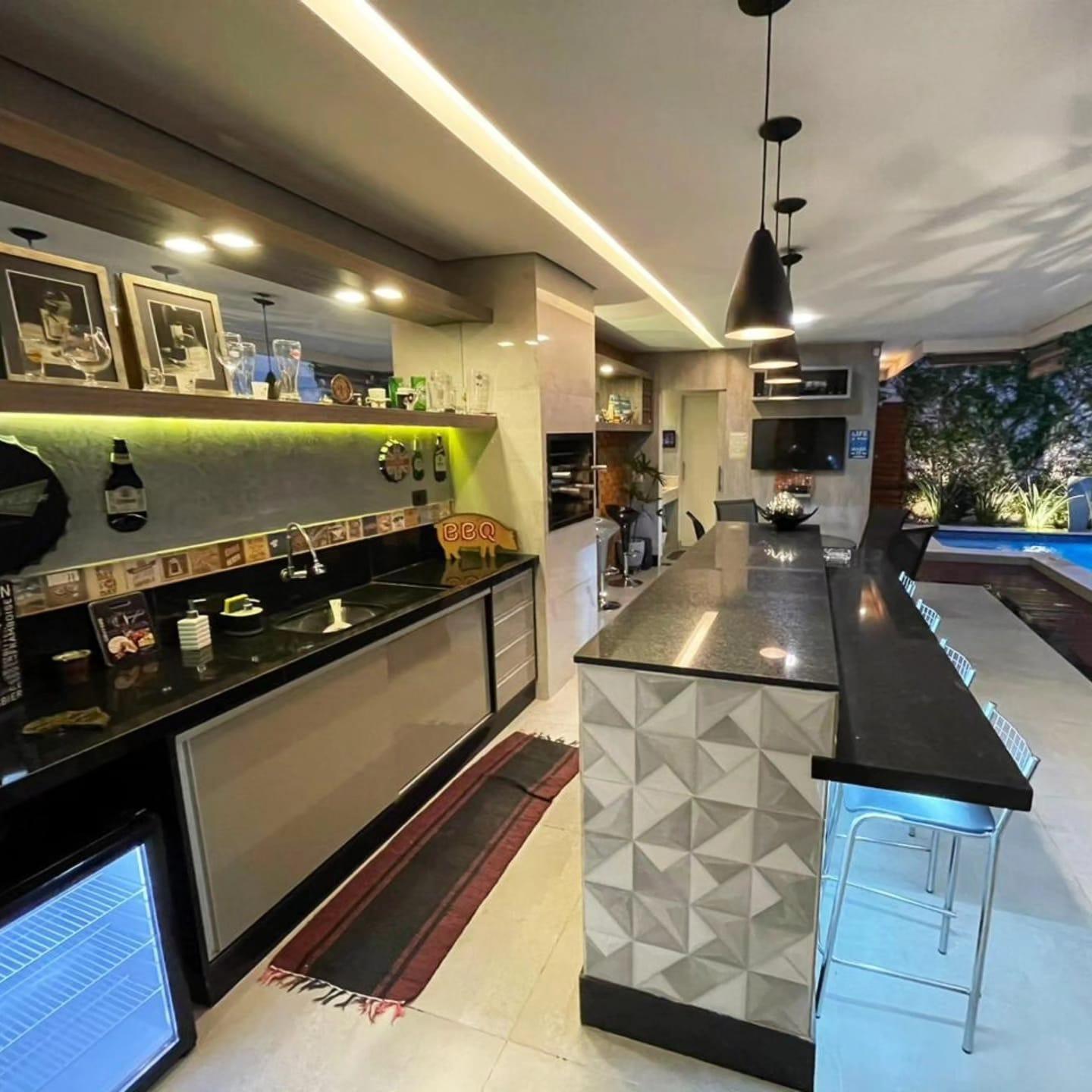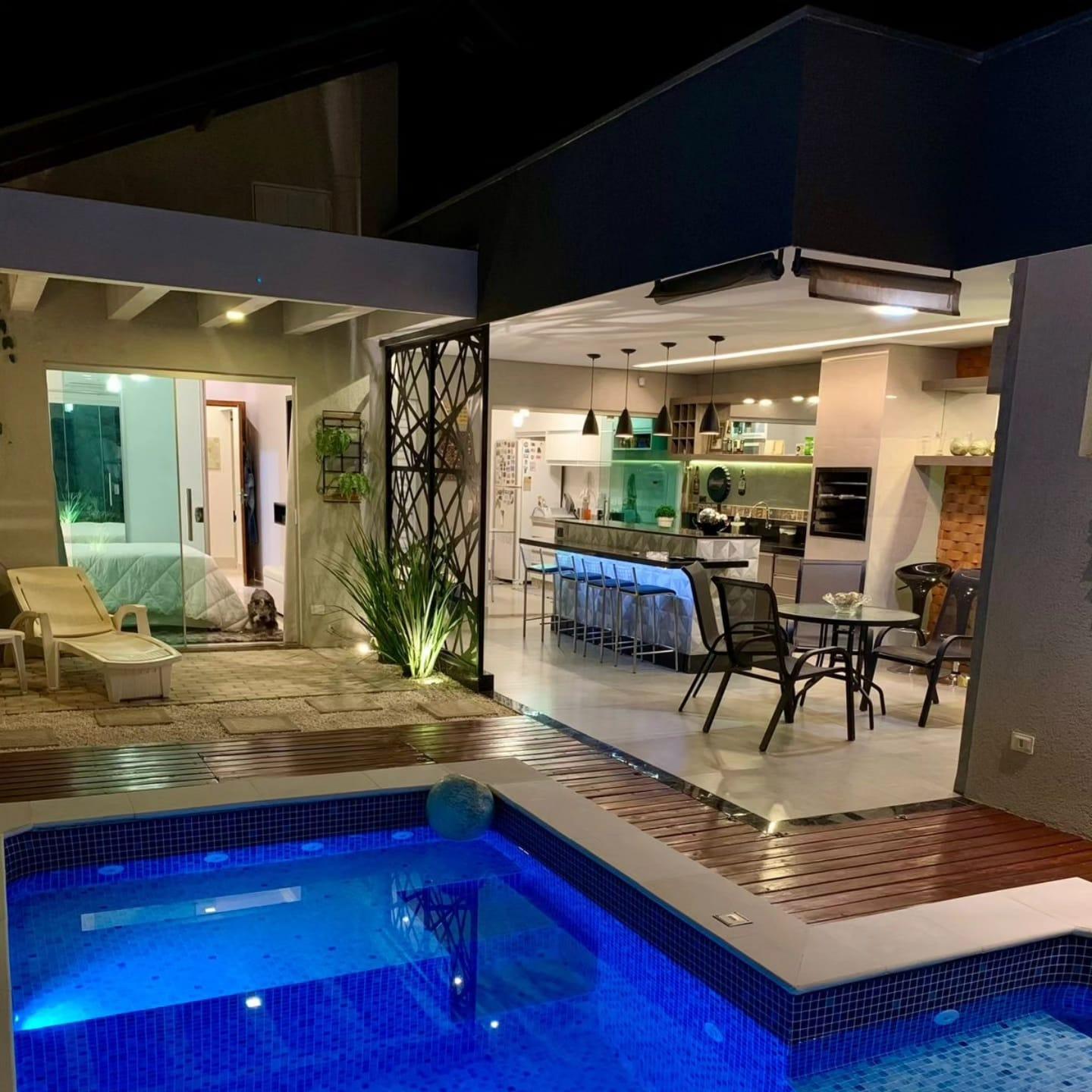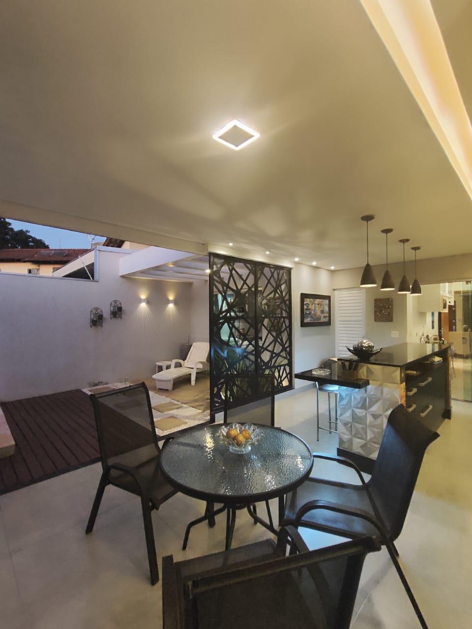 Composta por uma suíte com closet, armários planejados, rebaixamento em gesso com luz de Led com saída para piscina , dois quartos, sala dois ambientes com rebaixamento em gesso com Luz de Led, um wc social planejado, jardim de inverno, espaço gourmet completo com churrasqueira, frigobar, balcão/ ilha com quatro banquetes, adega, jardim, suspenso, rebaixamento em gesso luz de Led, manta térmica (o ambiente não esquenta), despensa com prateleiras grandes, piscina aquecida, com iluminação, hidro , cascata e prainha, área de serviço planejada, com espaço e encanamento para duas máquinas, lavabo externo. Possui três vagas com câmera de segurança, alarme e cerca elétrica.