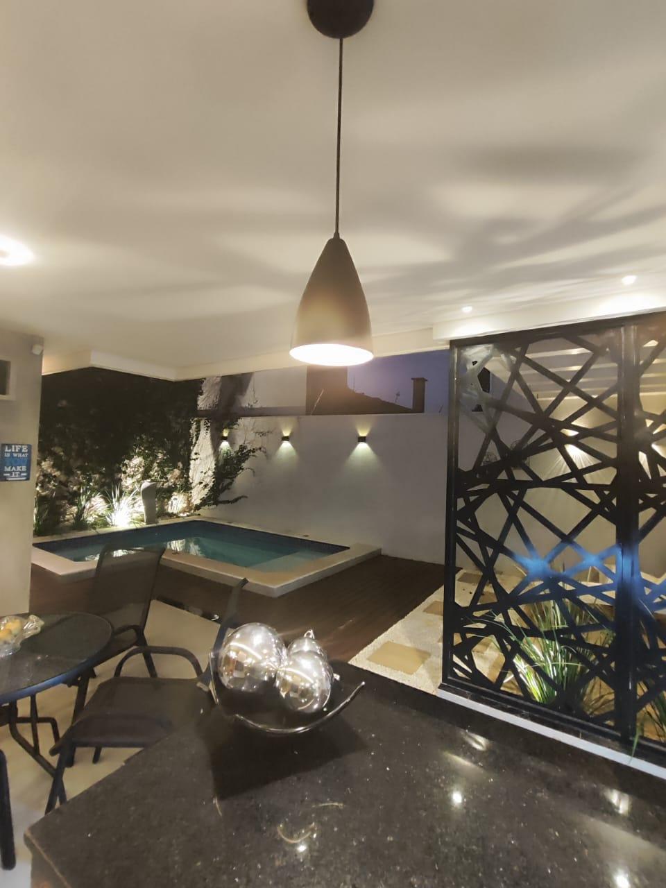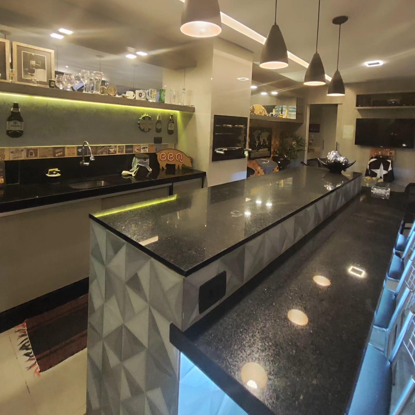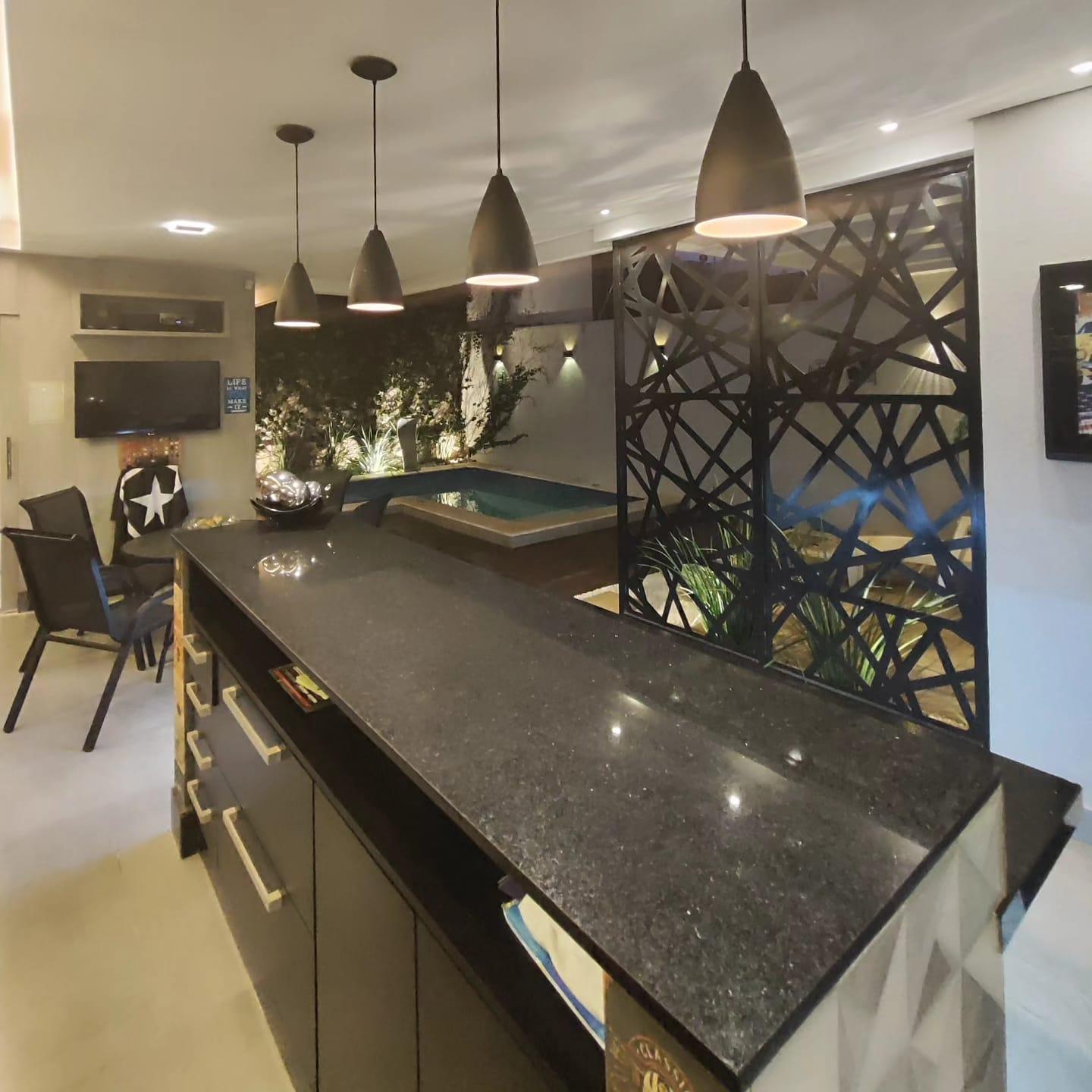 Composta por uma suíte com closet, armários planejados, rebaixamento em gesso com luz de Led com saída para piscina , dois quartos, sala dois ambientes com rebaixamento em gesso com Luz de Led, um wc social planejado, jardim de inverno, espaço gourmet completo com churrasqueira, frigobar, balcão/ ilha com quatro banquetes, adega, jardim, suspenso, rebaixamento em gesso luz de Led, manta térmica (o ambiente não esquenta), despensa com prateleiras grandes, piscina aquecida, com iluminação, hidro , cascata e prainha, área de serviço planejada, com espaço e encanamento para duas máquinas, lavabo externo. Possui três vagas com câmera de segurança, alarme e cerca elétrica.
