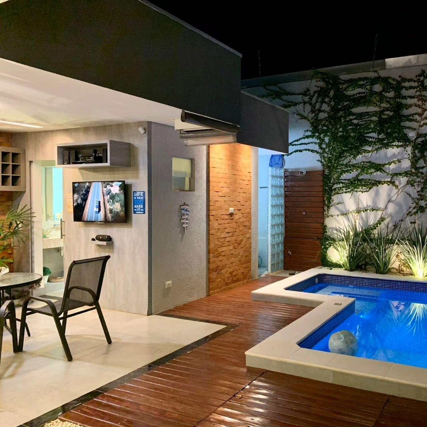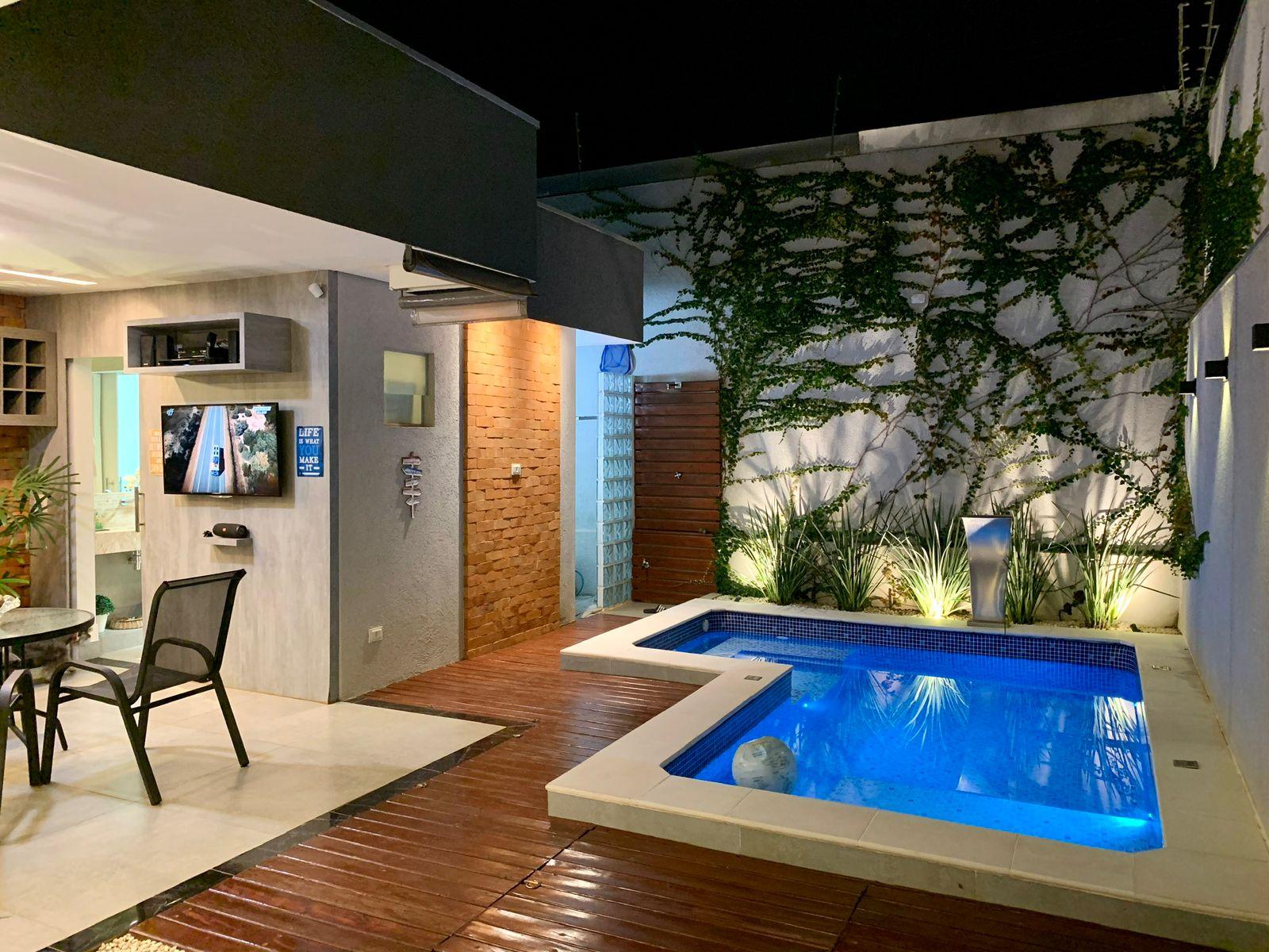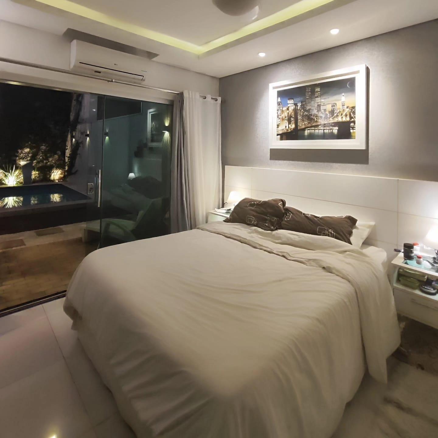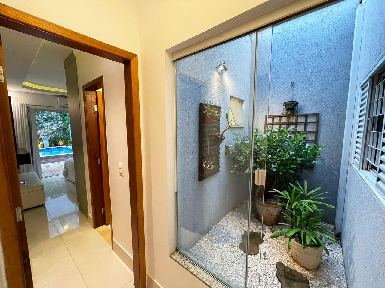 Composta por uma suíte com closet, armários planejados, rebaixamento em gesso com luz de Led com saída para piscina , dois quartos, sala dois ambientes com rebaixamento em gesso com Luz de Led, um wc social planejado, jardim de inverno, espaço gourmet completo com churrasqueira, frigobar, balcão/ ilha com quatro banquetes, adega, jardim, suspenso, rebaixamento em gesso luz de Led, manta térmica (o ambiente não esquenta), despensa com prateleiras grandes, piscina aquecida, com iluminação, hidro , cascata e prainha, área de serviço planejada, com espaço e encanamento para duas máquinas, lavabo externo. Possui três vagas com câmera de segurança, alarme e cerca elétrica.