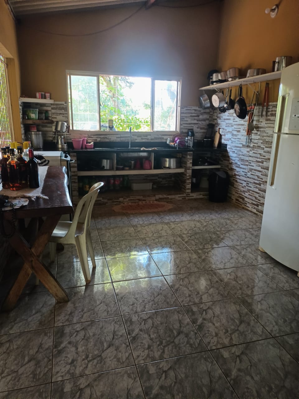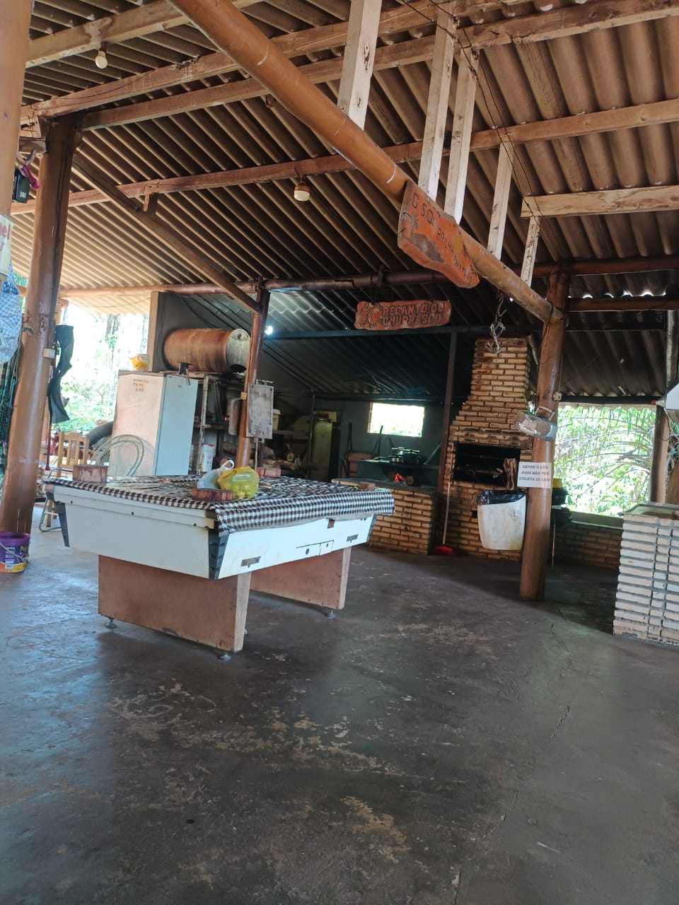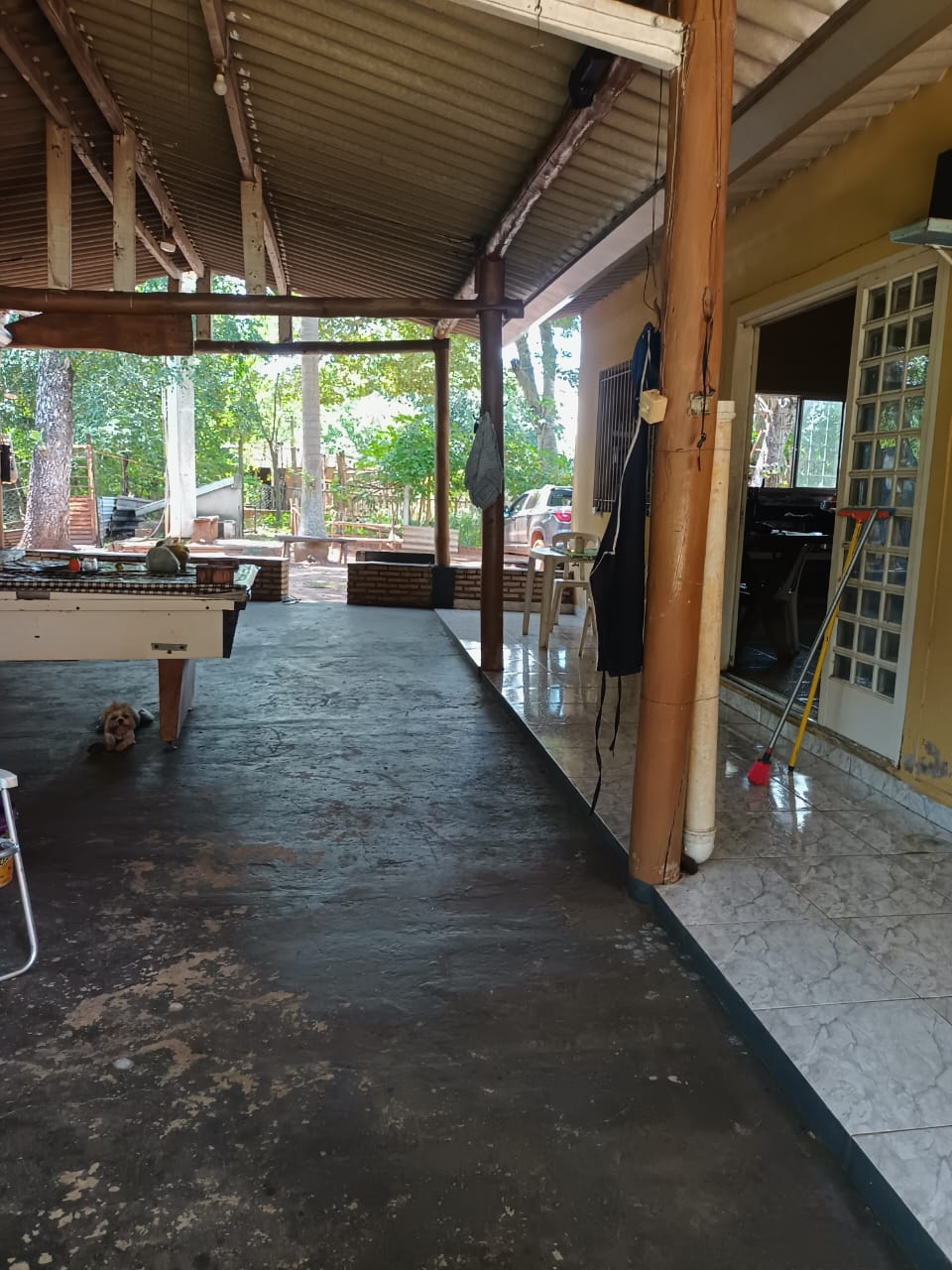 Casa com três quartos, sendo dois suítes, cozinha, varanda com churrasqueira, fogão a lenha, forno e uma mesa de sinuca.