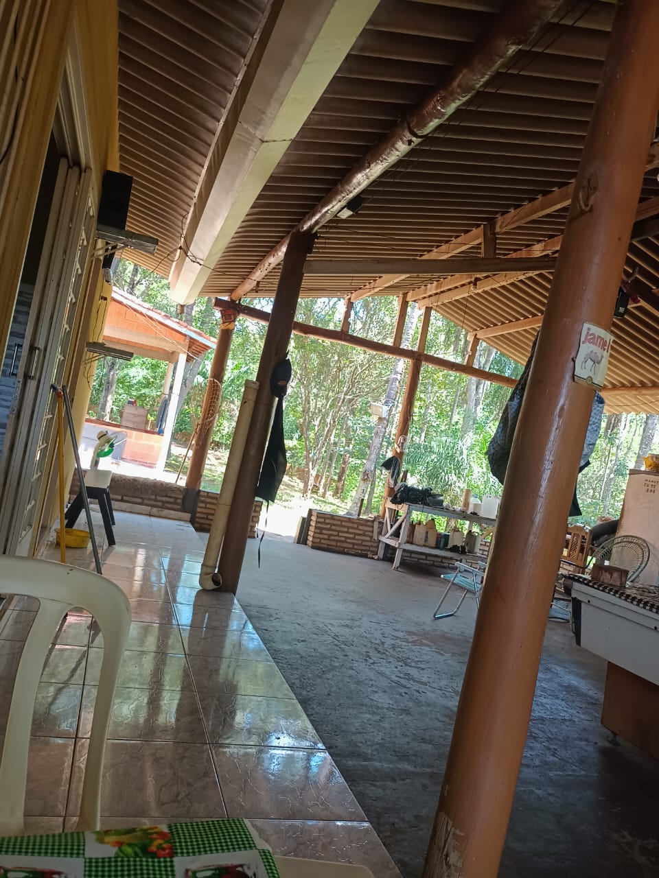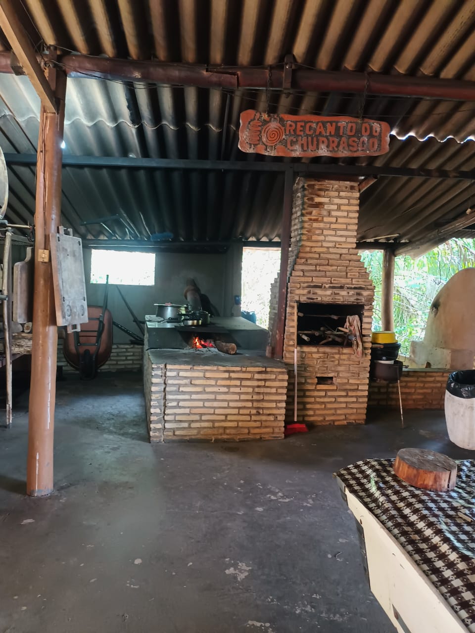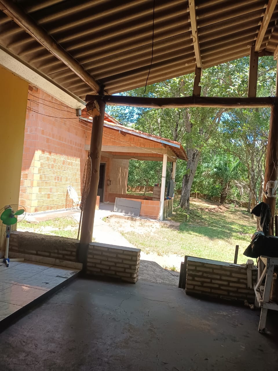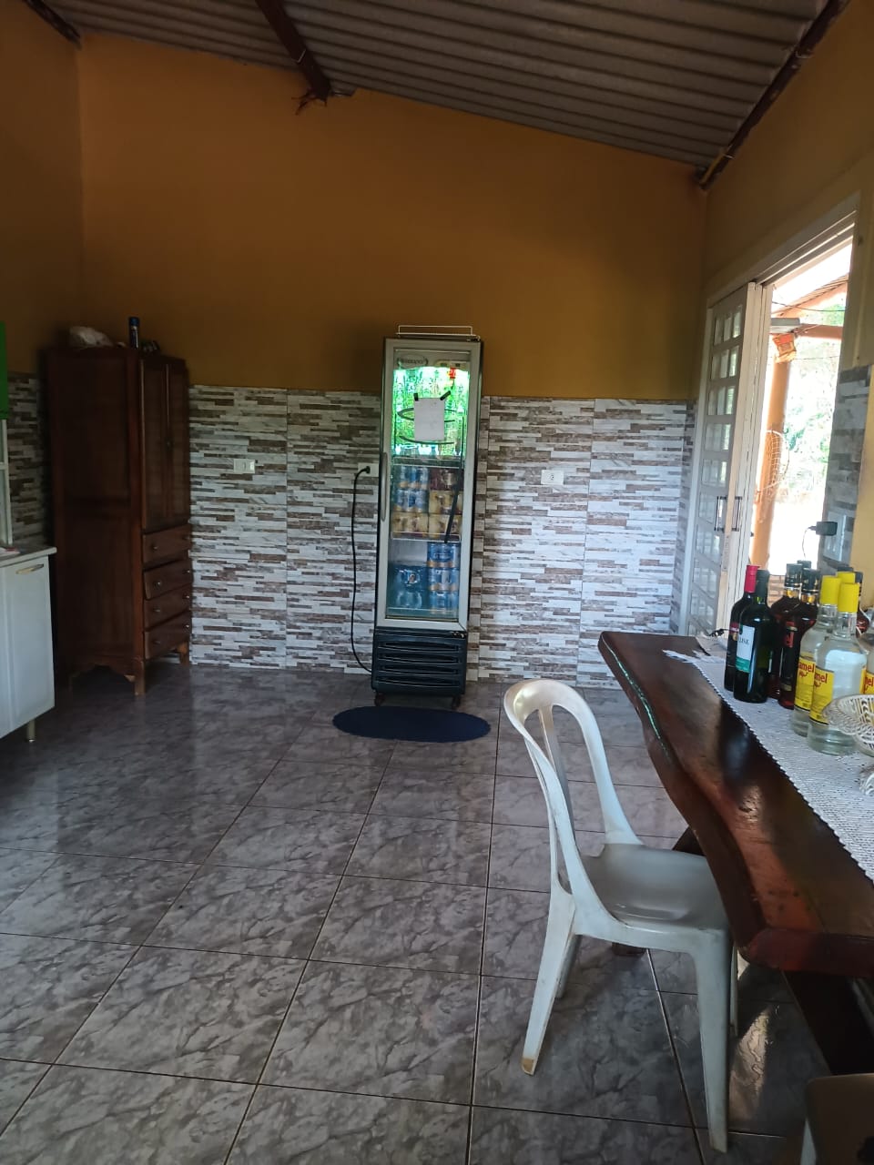 Casa com três quartos, sendo dois suítes, cozinha, varanda com churrasqueira, fogão a lenha, forno e uma mesa de sinuca.
